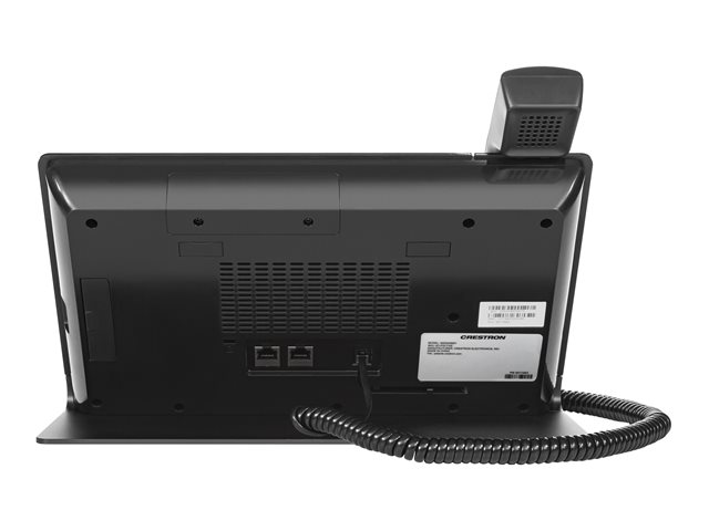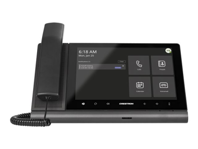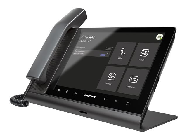 The Crestron Flex UC-P10-T-HS-I desk phone provides a premium voice-over-IP phone solution for use with the Microsoft Teams intelligent communications platform. It offers wideband HD voice quality and full-duplex hands-free speakerphone capability in an elegant desktop design. It features a large 10 in. color touch screen display, hearing aid compatible handset, and wired or Bluetooth enabled headset support. Each phone can be synced with a Microsoft Teams account, with contacts, schedules, voicemails, and other preference settings appearing on the phone's touch screen.
