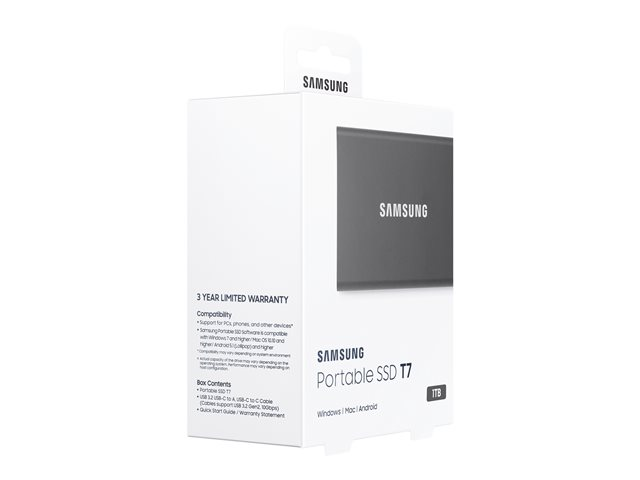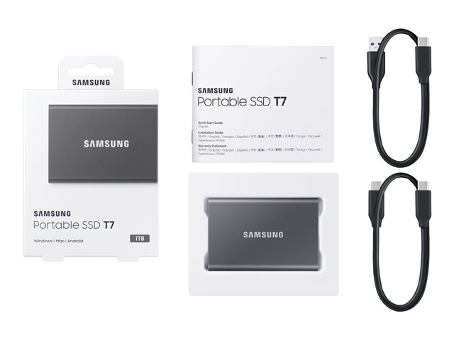 Samsung T7 MU-PC1T0T - SSD - kryptert - 1 TB - ekstern (bærbar) - USB 3.2 Gen 2 (USB-C kontakt) - 256-bit AES - titangrå MU-PC1T0T/WW