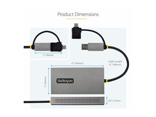 StarTech.com USB to Dual HDMI Adapter, USB A/C to 2x HDMI Monitors (1x 4K 30Hz, 1x 1080p), Integrated USB-A to C Dongle, 4in/11cm Cable, Windows & macOS - USB 3.0 to HDMI Multi-Monitor Display Adapter for Laptop (107B-USB-HDMI) - Video adapter - USB-type A, USB-C hann til 2 x 19 pin HDMI Type A hunn - grå - 4K-støtte
