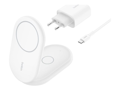 Belkin BoostCharge 2-in-1 - Trådløst ladestativ - magnetisk, sammenleggbar, med Qi2 + AC-strømadapter - 15 watt - Fast Charge - hvit - for Apple iPhone 12, 13, 14, 15, 16 WIZ028VFWH