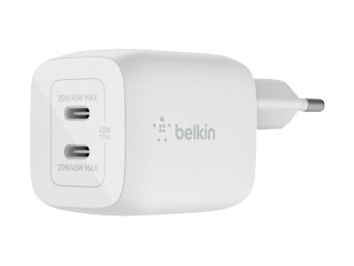 Belkin BoostCharge Pro GaN - Strømadapter - PPS- og GaN-teknologi - 45 watt - Fast Charge, PD 3.0 - 2 utgangskontakter (2 x USB-C) - hvit WCH011VFWH