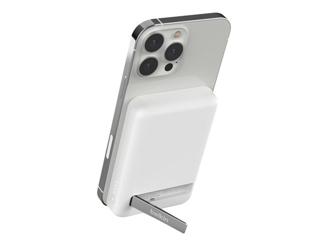 This portable Magnetic Wireless Power Bank 5K + Stand delivers a safe 7.5 W of wireless charging power to your device without cables or a need to connect to a power source. The fold-out stand offers a convenient and hands-free way to stream or video call while you charge.