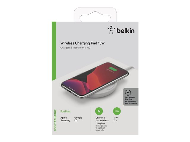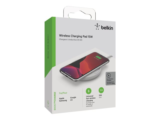 Belkin BoostCharge - Trådløs ladepute + AC-strømadapter - 15 watt - QC 3.0 - hvit WIA002VFWH