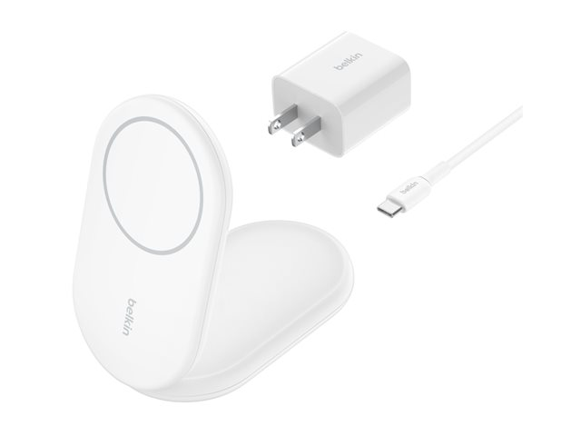 Belkin BoostCharge - Trådløst ladestativ - magnetisk, sammenleggbar, med Qi2 + AC-strømadapter - 15 watt - 3 A - Fast Charge, Power Delivery 3.1 - hvit