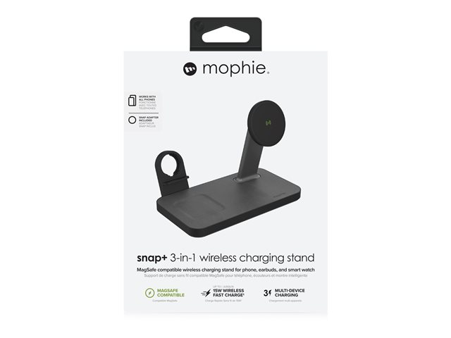 Lad alt. Alt på en gang. Snap+ 3-i-1 har en ladepute for trådløs telefon, en ladepute for trådløs hodetelefon og to klokkeadaptere som lar deg koble til Apple Watch eller Galaxy Smartwatch-laderen. Telefonstativet er MagSafe-kompatibelt og fungerer med ikke-magnetiske telefoner takket være snap-in-adapterringen. Få opptil 15 W strøm for Android-enheter eller opptil 7,5 W strøm for Apple-enheter.
