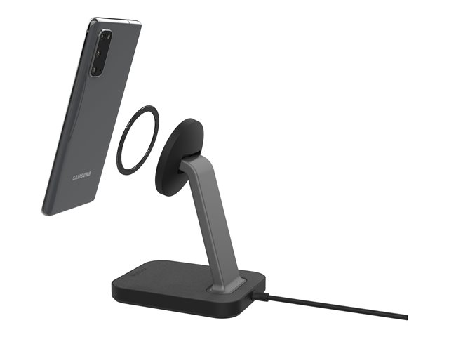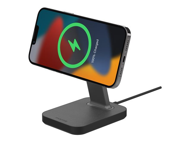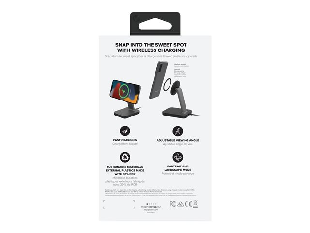 Forbedre bekvemmeligheten ved lading. Den MagSafe-aktiverte Snap+-laderen holder telefonen oppreist samtidig som den leverer opptil 7,5-15W trådløs kraft. Settet inkluderer også en snap-on-adapter som lar ikke-MagSafe-kompatible telefoner festes til stativet ved hjelp av magneter. Telefonen klikker umiddelbart på plass og lading starter ved kontakt. Snap+-laderen holder telefonen over rotet på skrivebordet, slik at du kan videochatte, se filmer eller skanne meldinger mens telefonen lades.