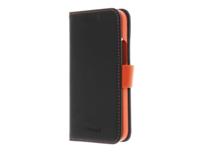 Insmat Exclusive Flip Case - Lommebok for mobiltelefon - ekte skinn, polykarbonat, bomullssting, kartong+papir - svart og oransje - for Apple iPhone 14 Plus 650-3107