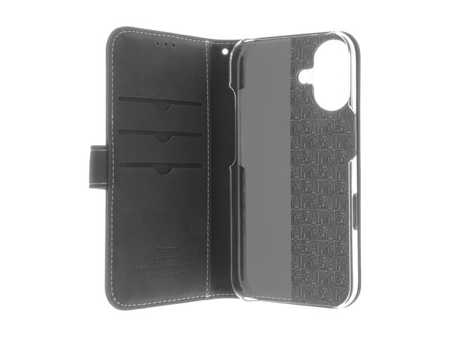 Insmat Exclusive - Lommebok for mobiltelefon - ekte skinn, kartong+papir+aluminiumsfolie, polykarbonat (PC), bomullssting - svart - for Apple iPhone 16 Plus