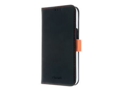 Insmat Exclusive - Lommebok for mobiltelefon - ekte skinn, polykarbonat, kartong+papir+aluminiumsfolie - svart, oransje - for Apple iPhone 15 Pro 650-3194