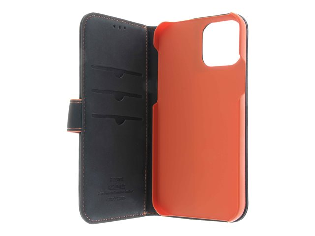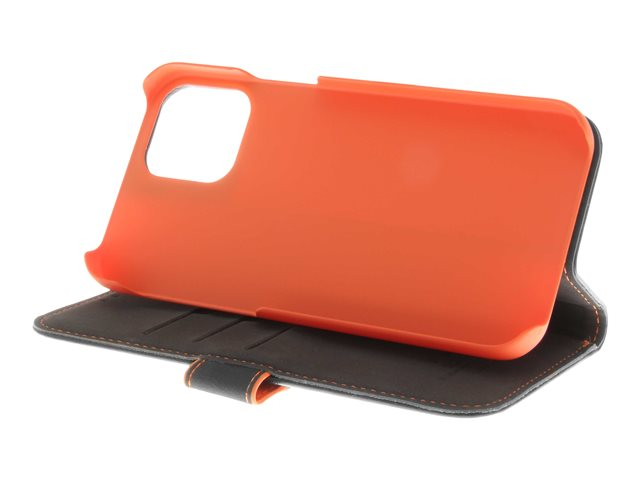 Insmat - Lommebok for mobiltelefon - ekte skinn, papir, polykarbonat, kartong, polyuretanpolstring - svart, oransje - for Apple iPhone 12, 12 Pro