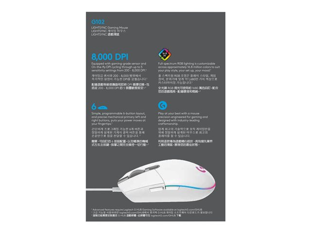 Make the most of your game time with the G102 gaming mouse featuring LIGHTSYNC technology, a gaming-grade sensor and a classic six-button design. Light up your game and your desk.
