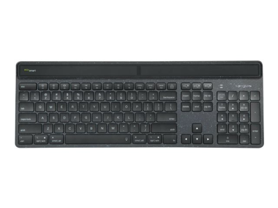 The Targus Sustainable Energy Harvesting EcoSmart French-language keyboard combines Bluetooth and advanced solar technologies with post-consumer recycled materials in an ecofriendly, full-size keyboard. Manufactured from up to 85% recycled material and infused with antimicrobial protection, this keyboard helps to prevent the growth of micro-organisms, while helping to protect the environment - even its packaging is recycled. It's primarily powered by solar cells optimized to harvest light from a variety of light conditions (including indoor artificial lighting) and connects to up to 3 devices using Bluetooth SoC, which means its extremely low-power capabilities makes it 3 to 4 times more power-efficient than other Bluetooth keyboards. And, this keyboard features Targus DefenseGuard antimicrobial protection. Unlike topically applied sprays, this DefenseGuard keyboard is infused with antimicrobial additives that don't wear or wash off, and works continuously for the life of the product.