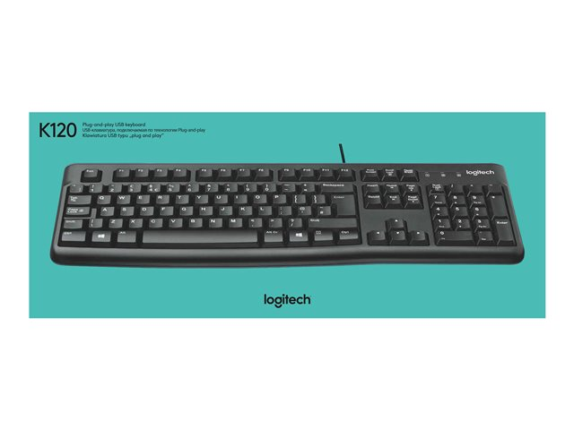 Logitech Keyboard K120 er et usb-tastatur som gjør det lettere å skrive, og som er laget for å vare. Hendene jobber komfortabelt på de flate, lydløse tastene, som har et standardoppsett med F-taster i full størrelse og numerisk tastatur. Du kan bare kople tastaturet til en usb-port på en stasjonær eller bærbar datamaskin, og skrive i vei. Dette slanke tastaturet er ikke bare elegant, det er også robust og vannavstøtende, og det har stødige føtter og taster som varer lenge.