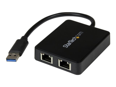 The USB32000SPT USB 3.0 to Dual Port Gigabit Ethernet Adapter lets you add two Gigabit Ethernet ports to your laptop or Ultrabook computer through a single USB 3.0 port, and features an integrated USB 3.0 pass-through port that keeps your USB port available for use with external storage or other peripherals. Each RJ45 port supports 10/100/1000 Mbps Ethernet and is fully compatible with IEEE 802.3i/u/ab standards.