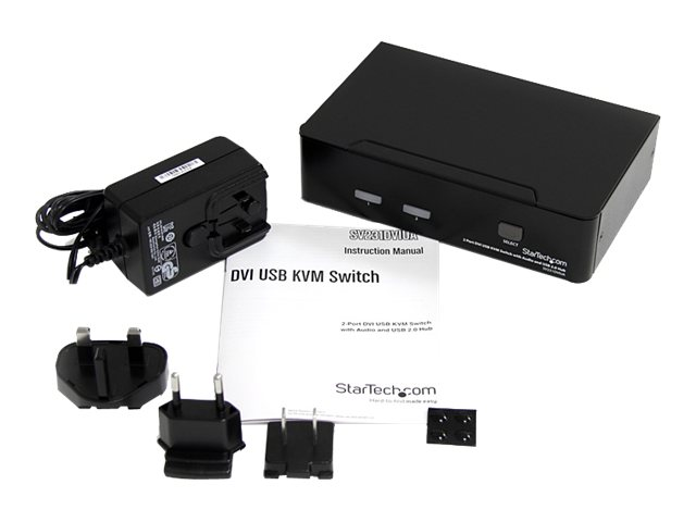 Share keyboard, mouse, speakers and a DVI display between two multimedia computers. The SV231DVIUA 2-Port DVI USB KVM Switch lets you control two USB-enabled, DVI-capable computers from a single monitor and peripheral set (keyboard, mouse and speakers), and two additional USB peripherals connected through the built-in USB hub ports.
