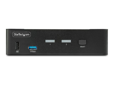 Share and switch between two USB-A and DisplayPort-enabled computers, using this DisplayPort KVM Switch. Share an 8K 60 Hz DisplayPort monitor, a keyboard and mouse, two USB 5 Gbps devices, and two additional USB 2.0 devices.