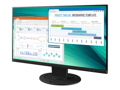 EIZO FlexScan EV2460-F4BK er en 24-tommers stasjonær skjerm som gir Full HD-oppløsning (1920 x 1080) med en pikselavstand på 0,275 mm. Den er designet med IPS TFT aktiv matriseteknologi og tilbyr en fargeopplevelse med støtte for 16,7 millioner farger. Med en lysstyrke på 250 cd/m2 og et kontrastforhold på 1000:1 fremstår bildene klare og tydelige, noe som gjør denne skjermen egnet for ulike oppgaver. Det antirefleksbelegget forbedrer synligheten under ulike lysforhold, noe som sikrer en behagelig seeropplevelse uten distraksjoner fra refleksjoner. Skjermen kan justeres i høyde, tilt og rotasjon, noe som gir optimal ergonomi og reduserer belastningen ved langvarig bruk.