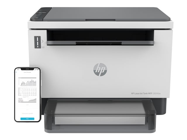 Discover business-ready capabilities and savings with HP LaserJet Tank MFP 2604dw all-in-one printer pre-filled with up to 5,000 pages of Original HP Toner.