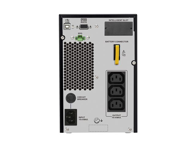 The APC Easy UPS On-Line SRV1KI-E provides reliable battery backup and surge protection for critical electronic equipment. Designed to support 900 watts of output power, this UPS is equipped with a robust lead acid battery system that is maintenance-free, sealed, and leak-proof. With a recharge time of 4 hours, it ensures devices are powered up quickly and efficiently. The vertical orientation allows for space-saving installation, making it a practical choice for various environments. Operating in temperatures ranging from 0°C to 40°C and humidity levels of 0 - 95% RH, this UPS can adapt to diverse conditions, providing protection in nearly any situation. With a total harmonic distortion of only 3% at full load, this system maintains a clean power supply. Features such as an LCD display, emergency power off, and intelligent battery management further enhance user experience and control. The APC Easy UPS On-Line is compliant with multiple standards, ensuring it meets rigorous environmental and safety requirements.