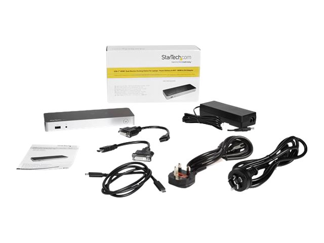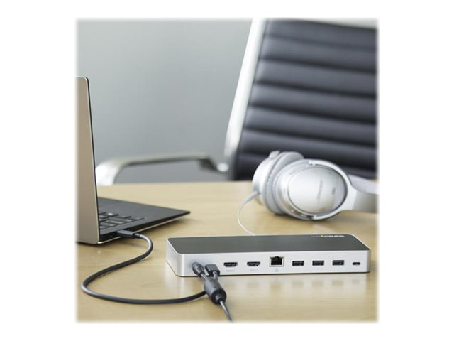 Enhance your productivity by turning your Windows USB-C laptop into a full-scale workstation. This dual-monitor USB-C dock lets you easily connect two HDMI monitors or DVI monitors (with included adapters) using one USB-C cable, with no setup of display drivers required, right out of the box. The USB-C dock provides 60W charging power, and five USB 3.0 ports to connect devices. With easy dual-monitor setup, the dock is ideal for wide-scale use in office workstations.