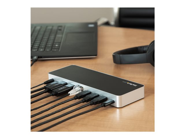 Ensure your laptop's drivers, firmware, and operating system are current prior to using the docking station. Video output capabilities depend on the video card and hardware specifications of the connected laptop. Not all USB-C ports support the full functionality of the USB Type-C standard. Ensure that your laptop's USB-C port supports DP Alt Mode and USB Power Delivery for the full functionality of the USB Type-C standard. Not all Thunderbolt 3 USB-C ports support the full functionality of the Thunderbolt 3 standard. Ensure that your laptop Thunderbolt 3 port supports USB Power Delivery.