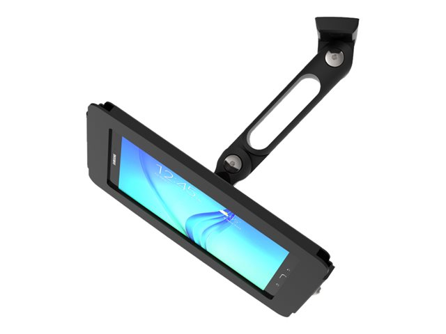 The Space Galaxy Tablet Enclosure features rounded edges and open corners for improved ventilation and allows for limited access to buttons and inputs. As with all the Galaxy tablet lock devices, the tablet can be continuously charged while in the enclosure and have peripheral cables plugged in while mounted.