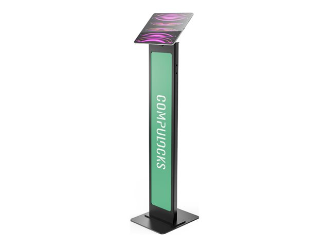 Our BrandMe floor stand allows you to utilize a panel for branding, call to action or custom design to bring attention to your interactive display or kiosk. The tilting mount allows the iPad enclosure to be set in either portrait or landscape mode and the stand base offers additional security features, securing the power source and bolting the unit to the floor.