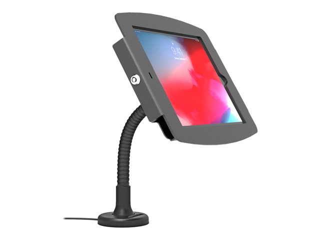 Our Flex Arm stand can be mounted on any flat surface, counter-top or to a wall for use as a secure interactive display or kiosk with a bendable arm that is great for corners and where counter space is limited. Limited cable management is available through the mount and arm of the stand and there is an adhesive no-screw base add-on available.