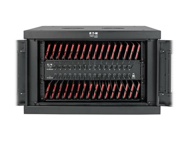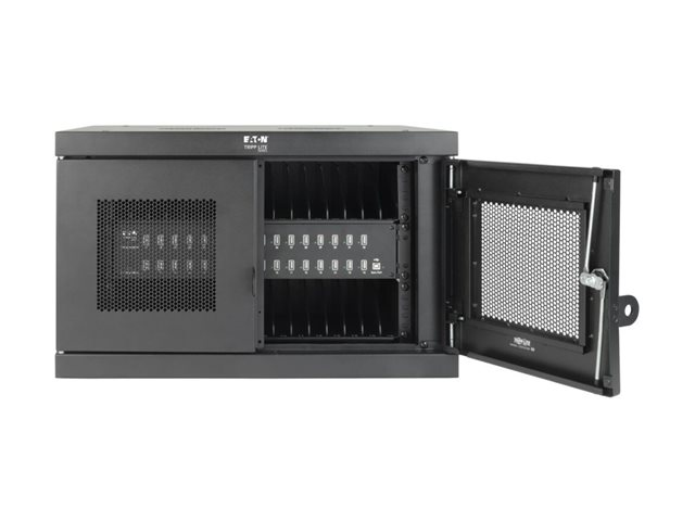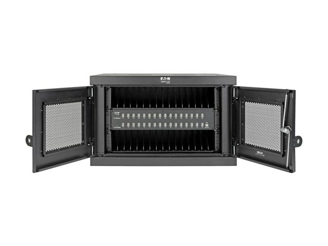 Eaton Tripp Lite Series 32-Device USB Charging Station Cabinet er en omfattende ladeløsning som er utformet for å dekke behovene i miljøer som skoler, kontorer og butikker. Med kapasitet til å lade opptil 32 enheter samtidig gjennom USB-A-portene, sørger dette skapsystemet for effektiv energidistribusjon og enhetsadministrasjon. Den allsidige designen gjør det mulig med både stasjonære og veggmonterte oppsett, noe som gir fleksibilitet i plassering i henhold til tilgjengelig plass og brukerens preferanser. Sikkerheten er prioritert med en nøkkellås og en låsbar frontdør som beskytter enhetene under lading. Skapet er konstruert av slitesterkt stål med en elegant svart pulverlakkert overflate, og er ikke bare robust, men passer også sømløst inn i ethvert profesjonelt miljø. Tilleggsfunksjoner som EMI- og RFI-filtrering, hurtigladefunksjoner og et omfattende monteringssett gjør det til et viktig verktøy for sikker og effektiv håndtering av flere enheter.