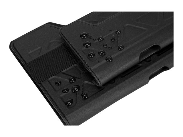 Smooth nylon loops slide easily over any standard belt to deliver handy, at-the-waist storage and protection for 7" - 8" tablets. Flexible elastic side panels provide a snug, secure fit for uncased tablets or those with ruggedized protection. A convenient front compartment similarly secures smartphones up to 4.7", keeping your business-essential devices close at hand.